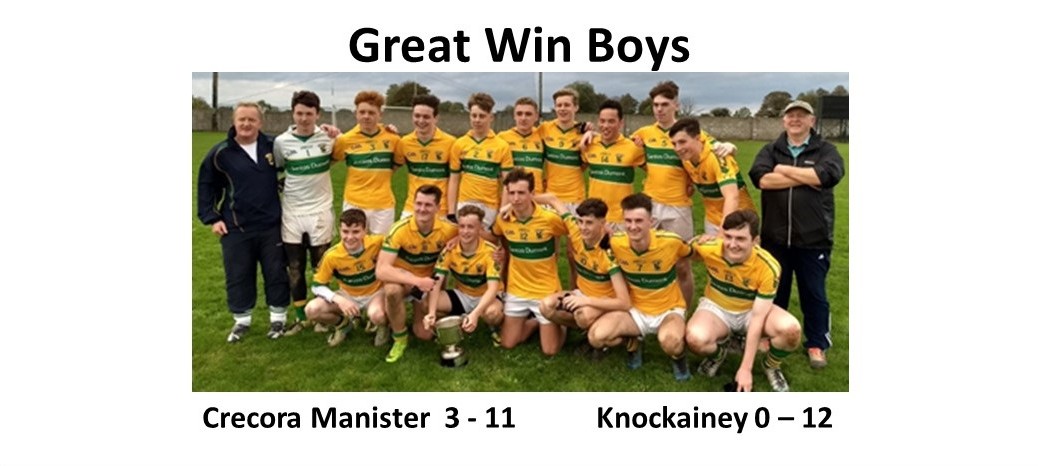 Just like in the semi-final we finished strongly with Padraig Byrnes and Matthew Stenson keeping the Knockainey defence under pressure it paid dividends as Karl and Peter Boohan scored a couple of excellent points. With just a couple of minutes remaining a quick ball was played in from midfield which Peter ran on to and with one touch he tucked just inside the left post for a great goal. It was like something that you would see at the Markets Field. We went on to win the game with a full time score of Crecora Manister 3 – 11 Knockainey 0 – 12